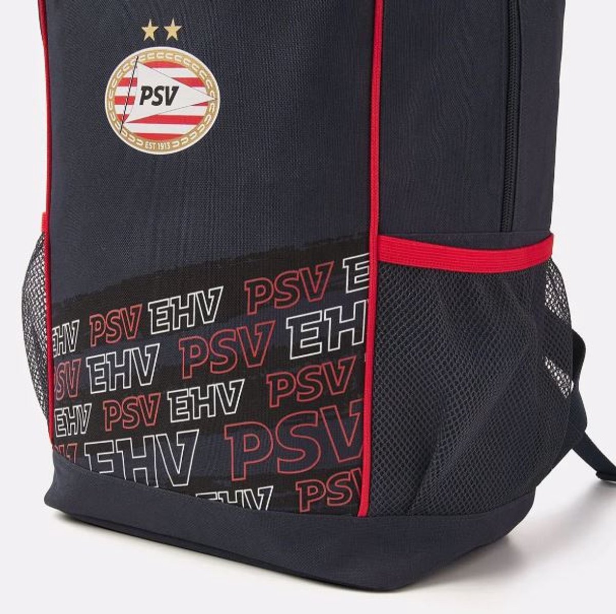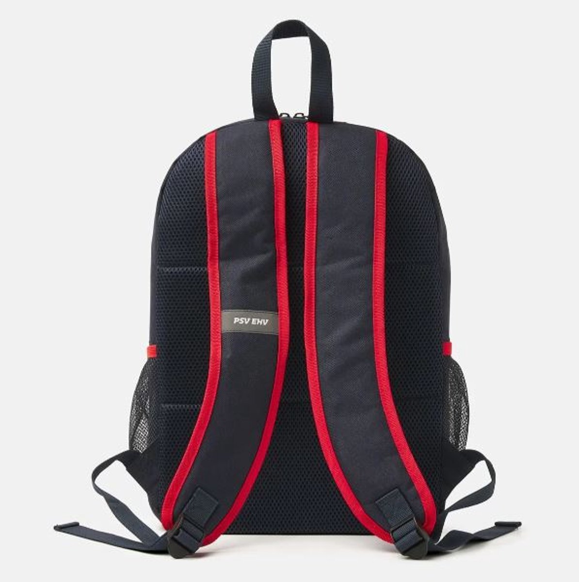 Aan beide zijkanten is de PSV Rugzak EHV Donkerblauw-Rood Klein voorzien van een elastisch gaas waar je je drinkfles in kwijt kunt. Dankzij de gevoerde en verstelbare banden geniet je van optimaal draagcomfort. Voor extra veiligheid vind je aan de achterzijde een reflecterend label met de tekst ‘PSV EHV’.